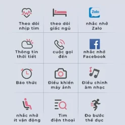 - Các chức năng cơ bản Bước đi, khoảng cách, lượng calo, nhịp tim/huyết áp/oxy, cuộc gọi BT, nhạc BT, nhiệt độ, theo dõi, theo dõi giấc ngủ,